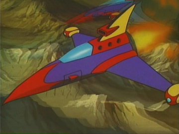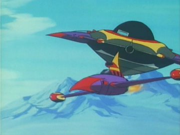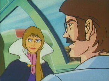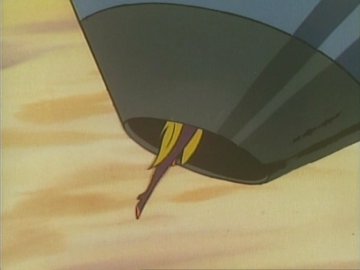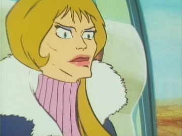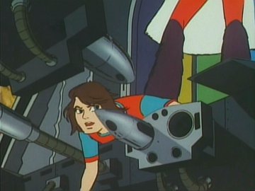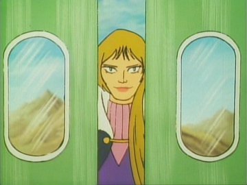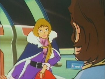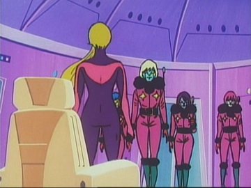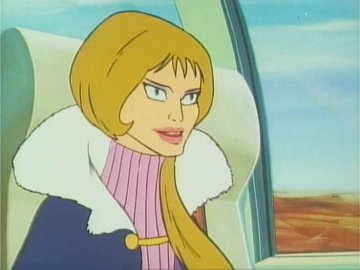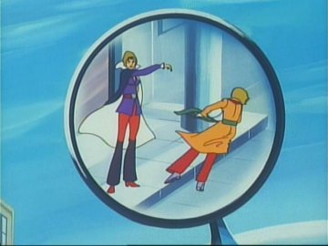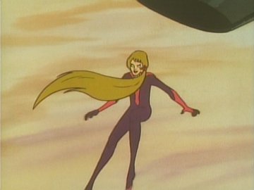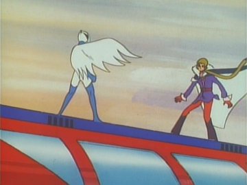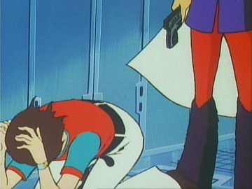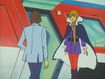 Lastly: two animated gifs (linked to separately so they don't slow the loading of the page; press the "back" button on the browser to return to this page) showing the "ripping off the disguise" scene, or rather the putting on of a uniform over the disguise (unless she was wearing a second pink turtleneck under the first one) and the Galactor captain's physical prowess as she jumps backwards over a train seat (kids, don't try this at home) to evade the Eagle.