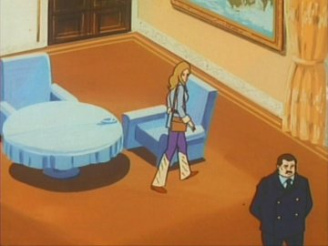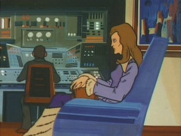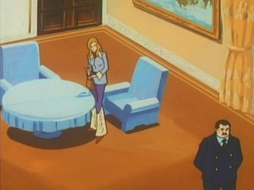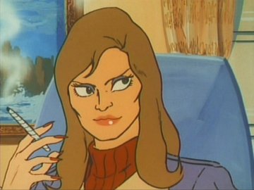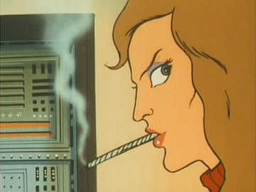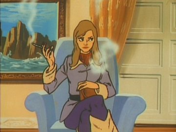 Seated in a chair that colours rather well with her clothes, she talks in a biting voice, mentioning the name "Galactor" several times (chewing out the worried-looking guy in the suit, probably), smiles like a centerfold and spreads smoke all over the place.