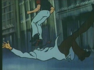 It is only then that fate finally brings the two together (and how clever that Joe should recognize through a sheet of rain a character he only knows from a very old photograph and a rear view mirror glimpse) and Joe fumes: "I'll get you! Right after I've finished wasting precious time stamping on the doctor!"